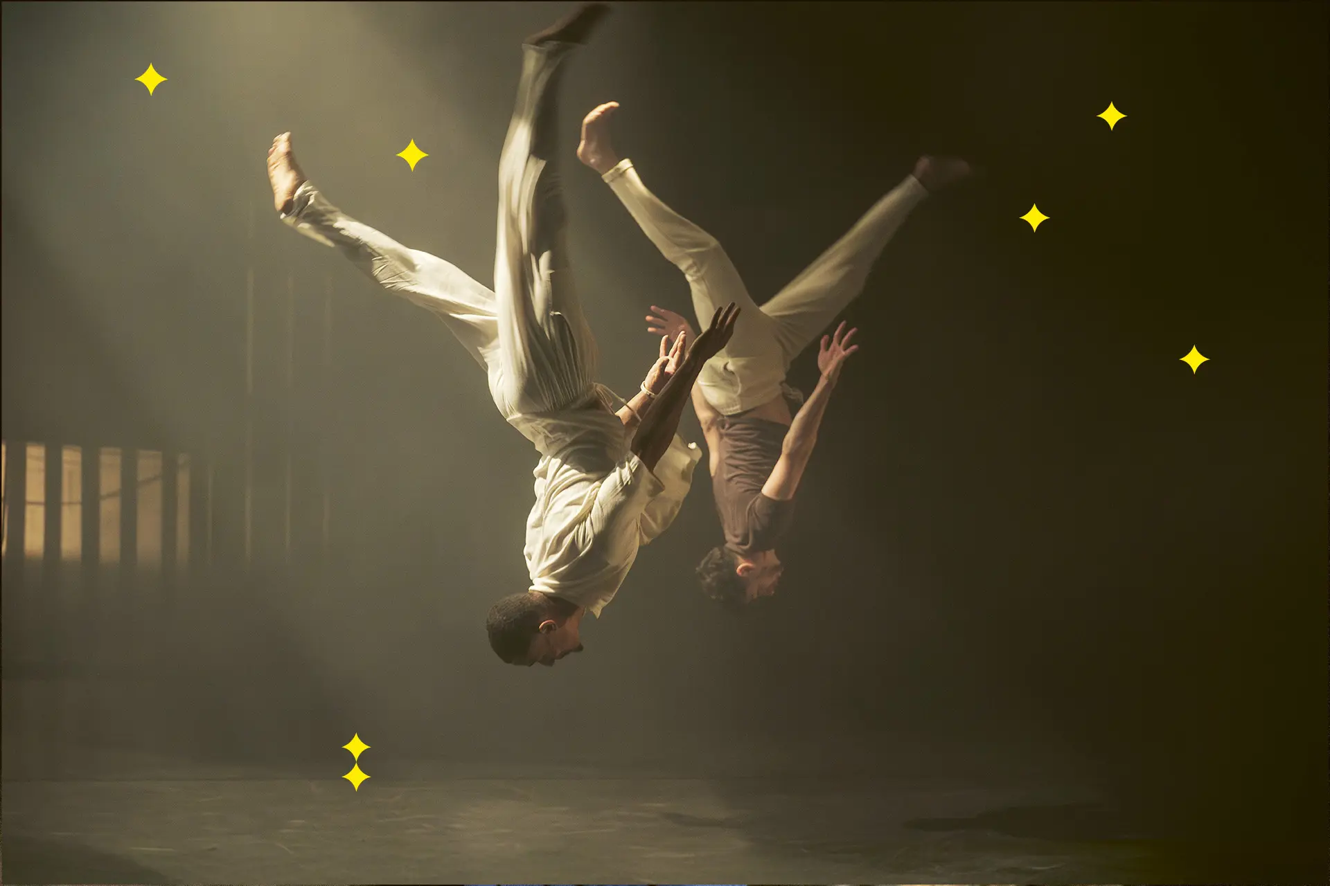 Ils sont 13. Dix hommes et 3 femmes. Danseurs hip‑hop, porteurs, équilibristes, jongleurs. Tous et toutes acrobates. Ils offrent un spectacle organique, puissant et drôle, explorant le cercle comme symbole du temps, de la renaissance et de l’unité. Éclairés par les lumières ciselées en clair‑obscur, les acrobates racontent aussi Tanger : la mer, le ciel, le cosmopolitisme de cette ville frontière si près et si loin de l’Europe. La troupe perpétue les pyramides humaines de leurs ancêtres, utilisées pour observer au-delà des murailles et repérer les ennemis.